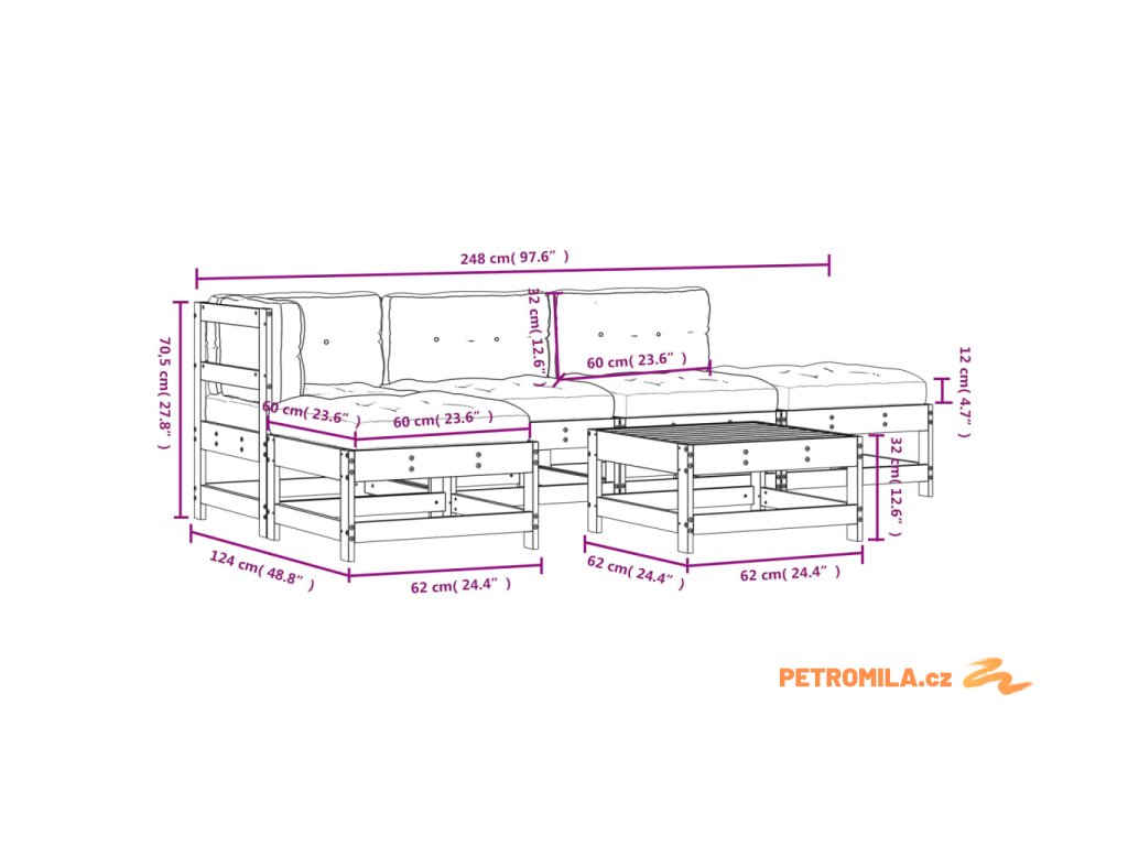 - Rozměry středové pohovky: 62 x 62 x 70,5 cm (D x Š x V)