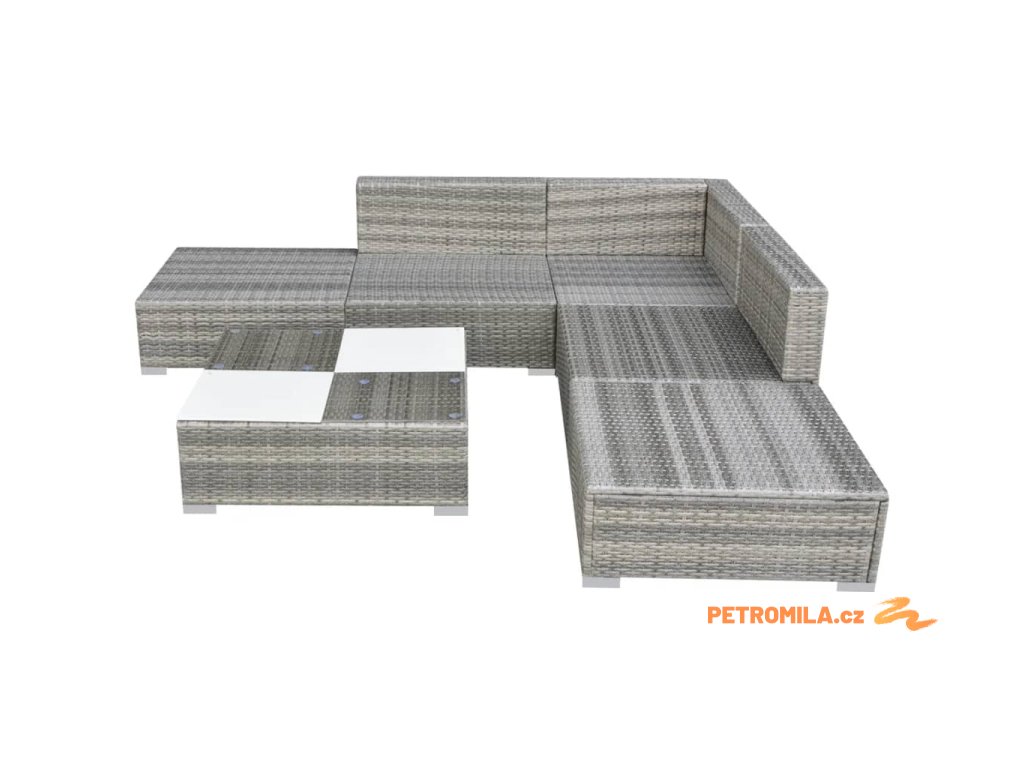 Balení obsahuje 1 rohovou pohovku, 2 středové pohovky, 2 podnožky, 1 čajový stolek, 5 polštářů a 4 podušky na opěradla. Poznámka: Doporučujeme vám soupravu za deště, sněhu a mrazu přikrýt.