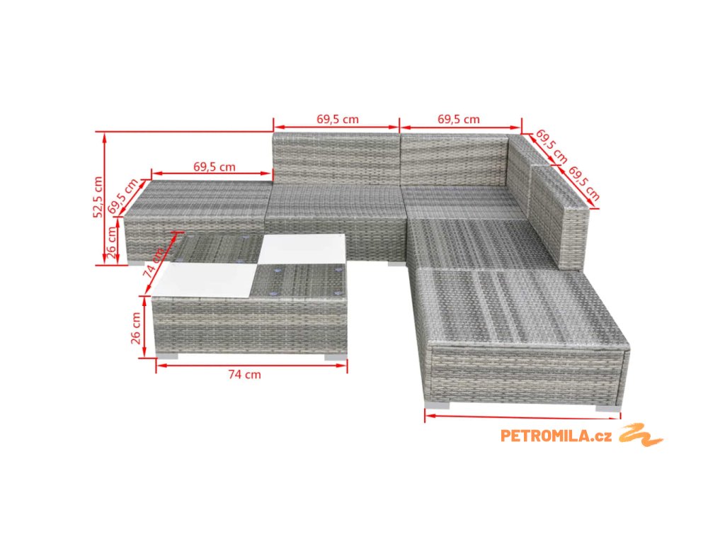 - Rozměry středové pohovky: 69,5 x 69,5 x 52,5 cm (Š x H x V)