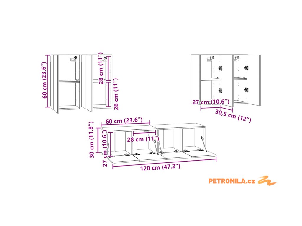 - 4 x TV skříňka: 30,5 x 30 x 60 cm (Š x H x V)
