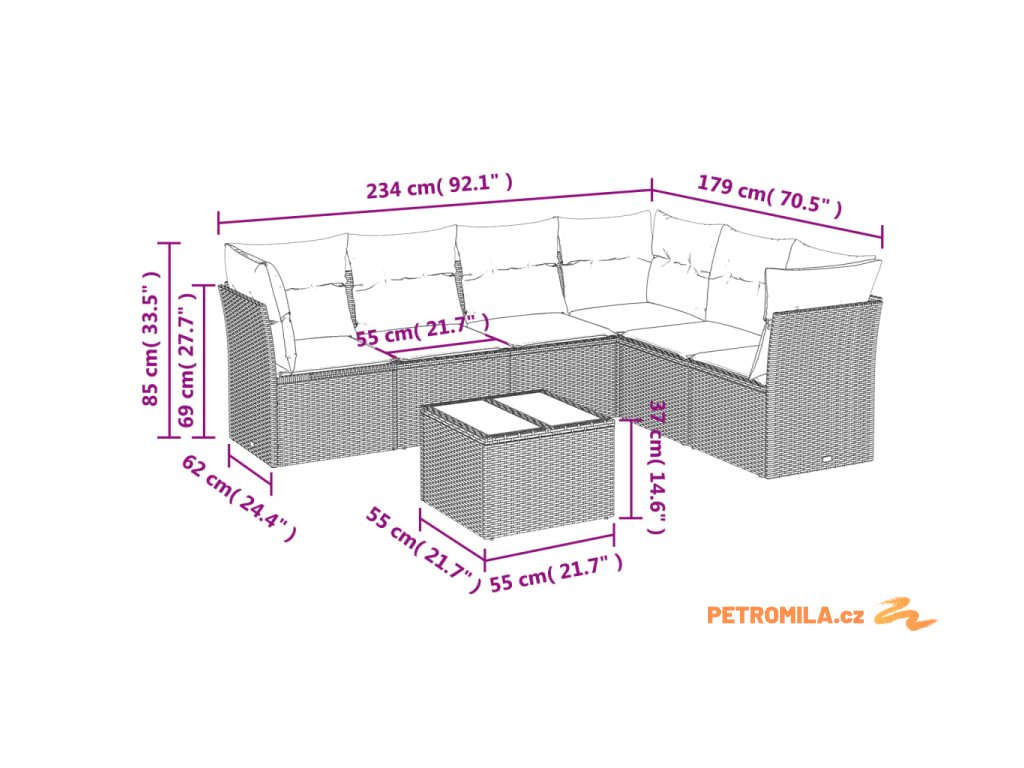 - Celkové rozměry pohovky: 234 x 179 x 69 cm (Š x H x V)