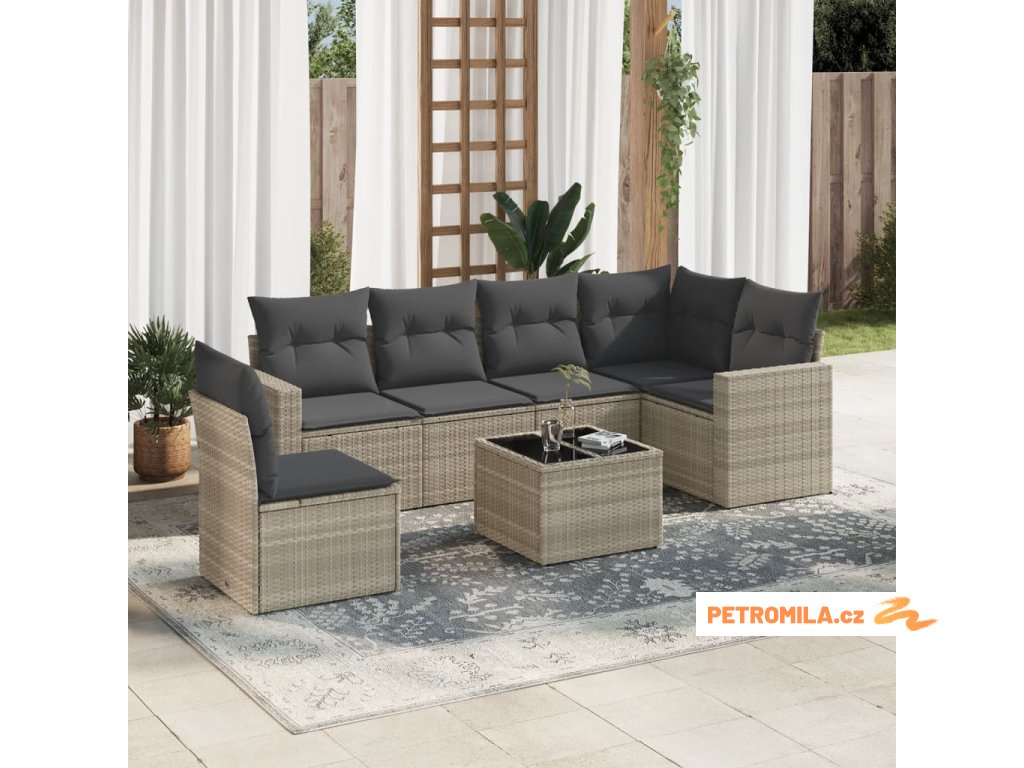 7dílná zahradní sedací souprava a podušky světle šedá polyratan