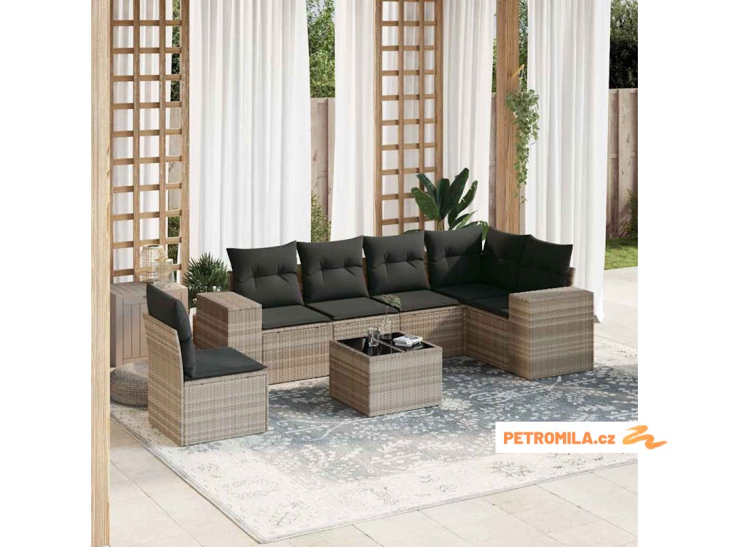 7dílná zahradní sedací souprava a podušky světle šedá polyratan