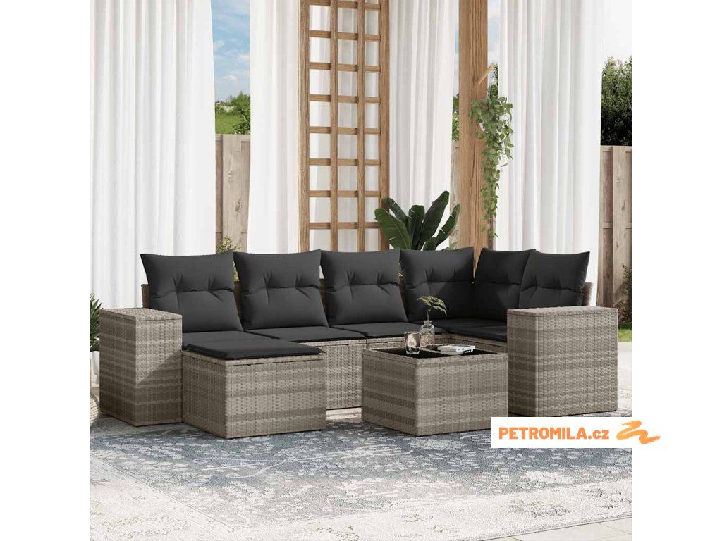 7dílná zahradní sedací souprava a podušky světle šedá polyratan