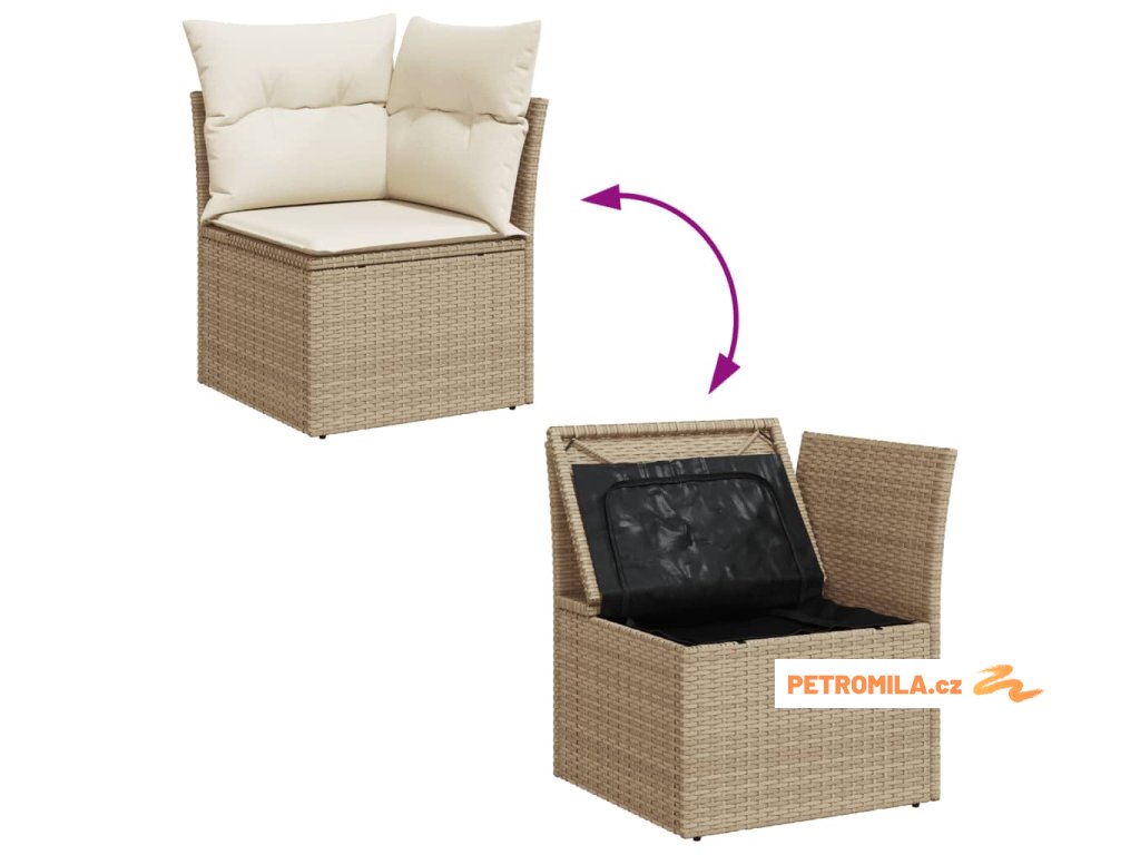 - Úložný prostor s voděodolným vakem: Každý zahradní sedací díl má úložný prostor pod sedákem, který je opatřen voděodolnou vložkou a poslouží vám k ukládání podušek, hraček a dalších věcí. Vnitřní vaky mají horní kryt a lze je bezpečně připevnit k sedákům pomocí suchého zipu, což zaručí větší stabilitu.