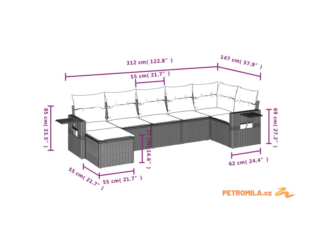 - Rozměry podušky za záda: 55 x 45 x 13 cm (D x Š x T)