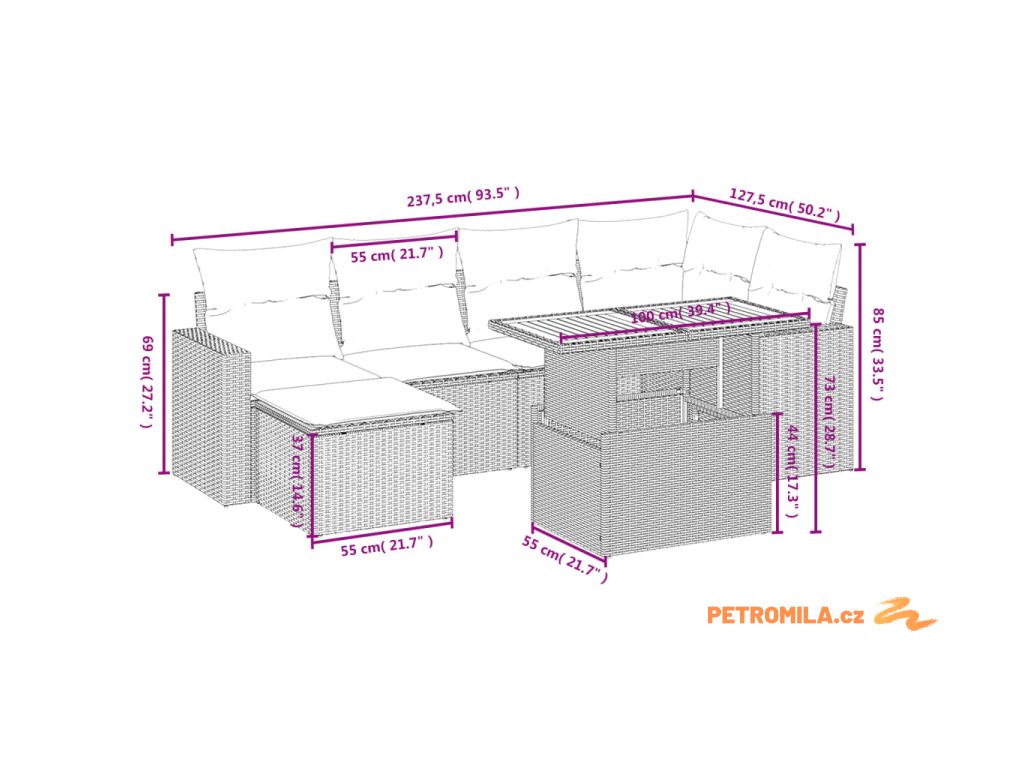 - Rozměry: 100 x 55 x 44/73 cm (D x Š x V)