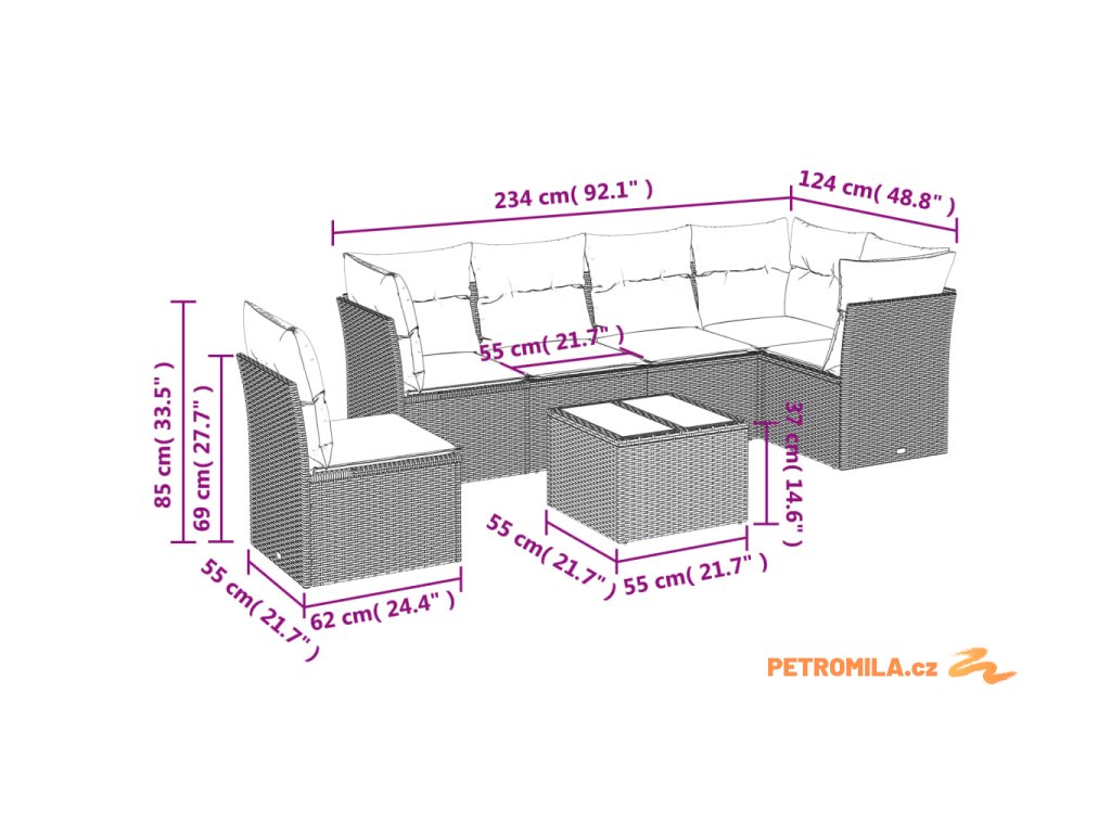 - Celkové rozměry 5místné pohovky: 234 x 124 x 69 cm (Š x H x V)