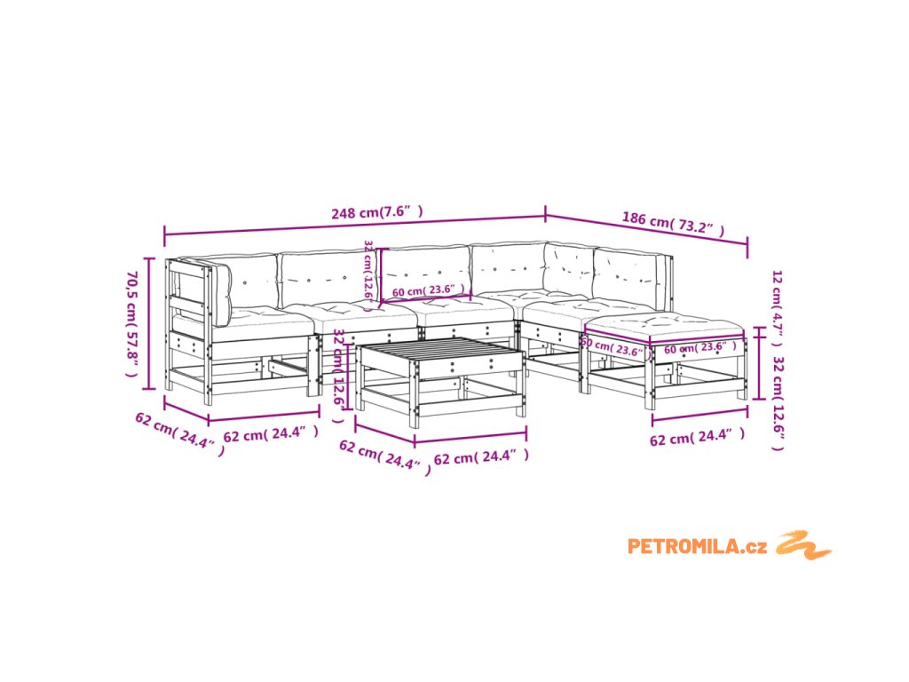 - Rozměry středové pohovky: 62 x 62 x 70,5 cm (D x Š x V)
