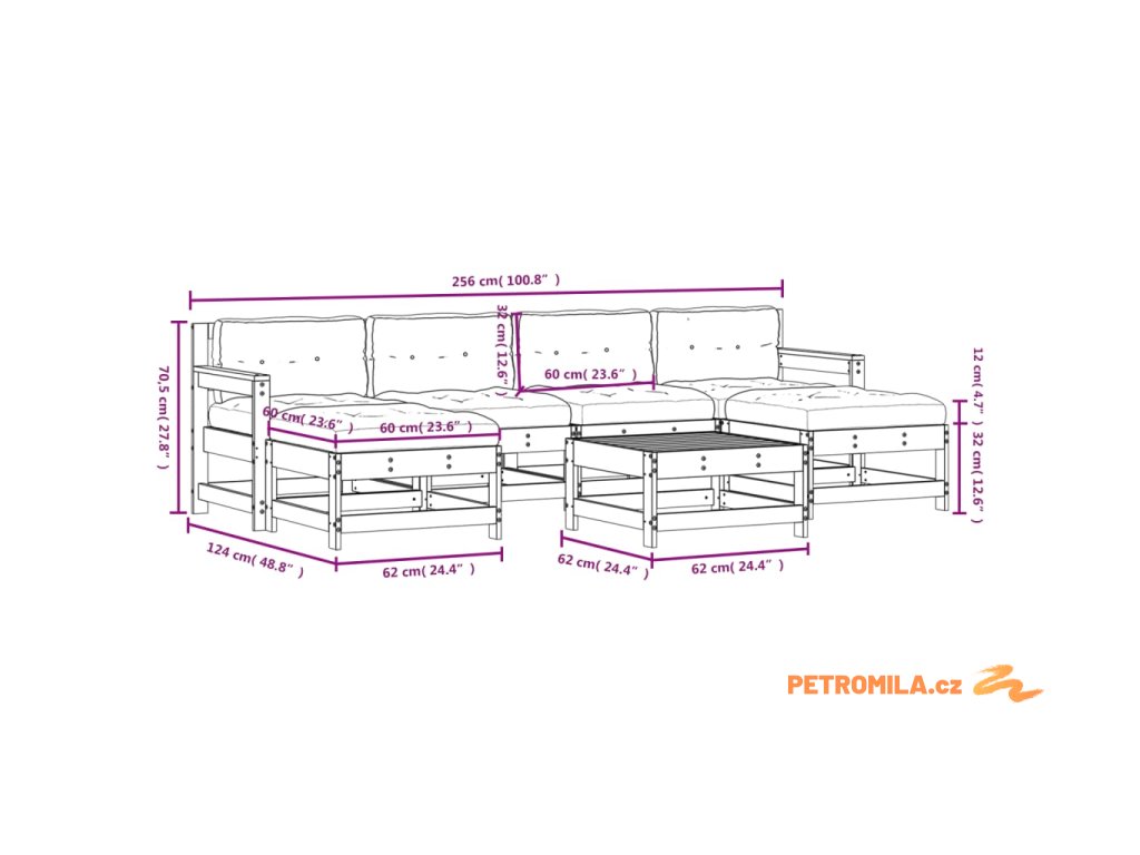 - Rozměry středové pohovky: 62 x 62 x 70,5 cm (D x Š x V)