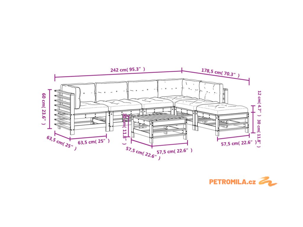 - Rozměry středové pohovky: 57,5 x 63,5 x 60 cm (D x Š x V)