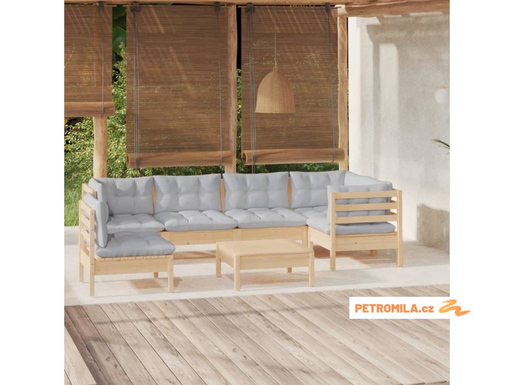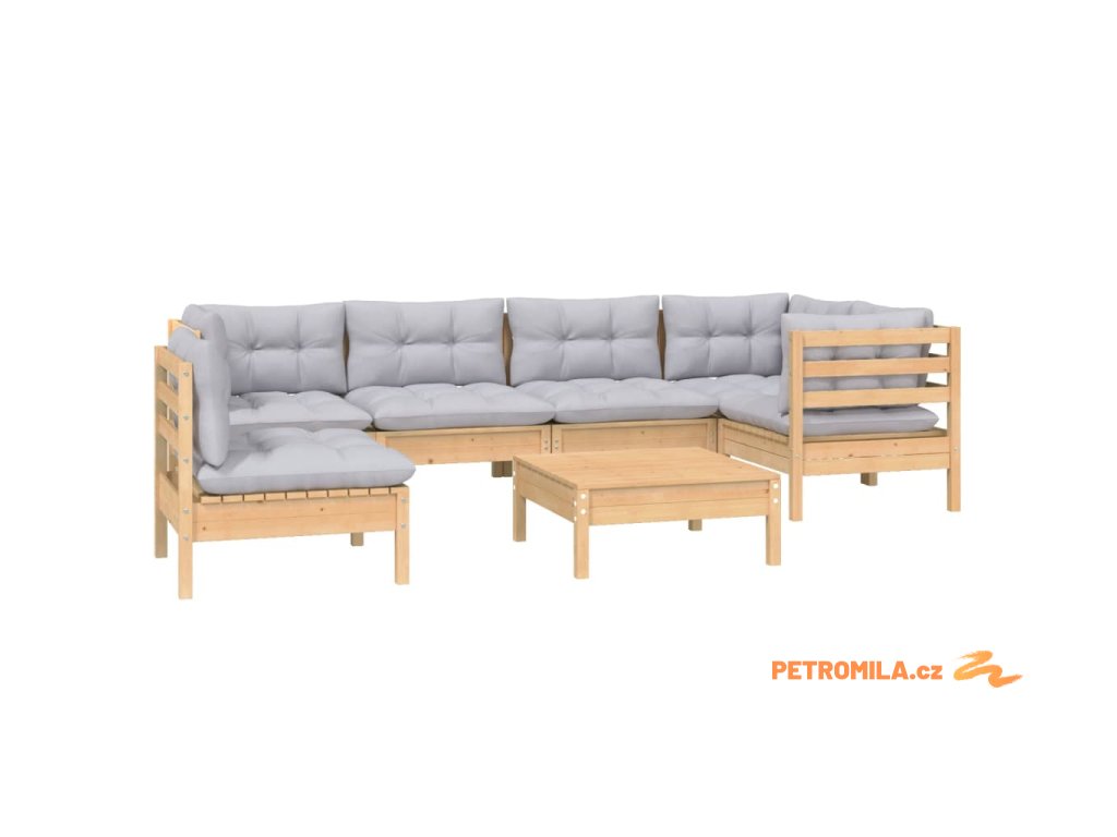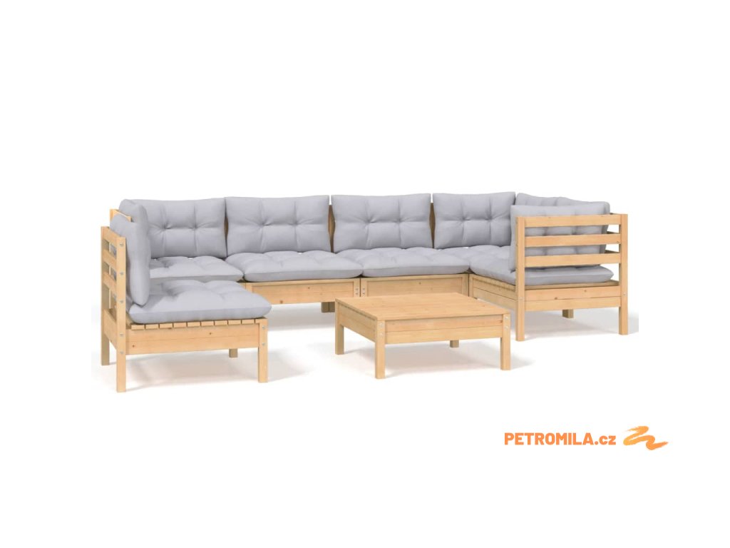7dílná zahradní sedací souprava s šedými poduškami borovice
