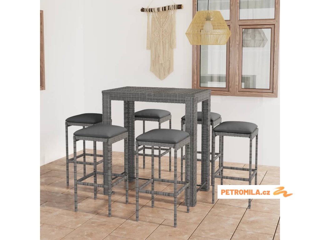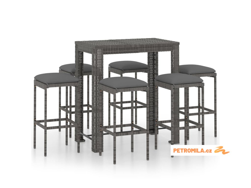 7dílný zahradní barový set s poduškami polyratan šedý