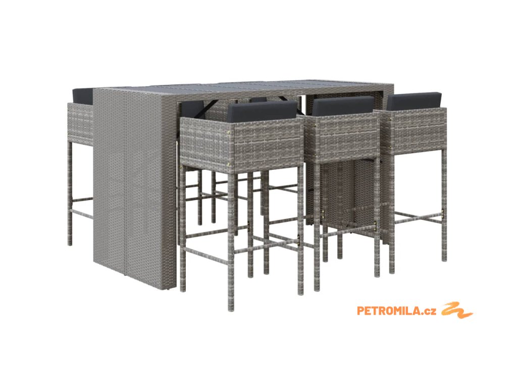 7dílný zahradní barový set s poduškami šedý polyratan