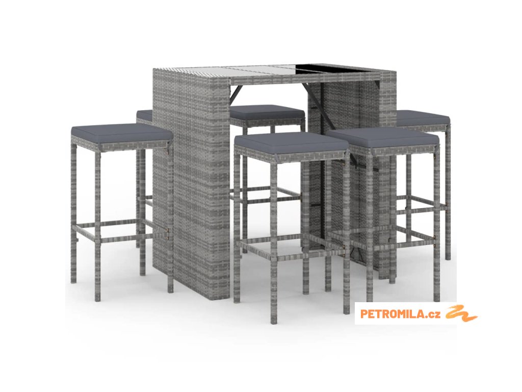 7dílný zahradní barový set s poduškami šedý polyratan