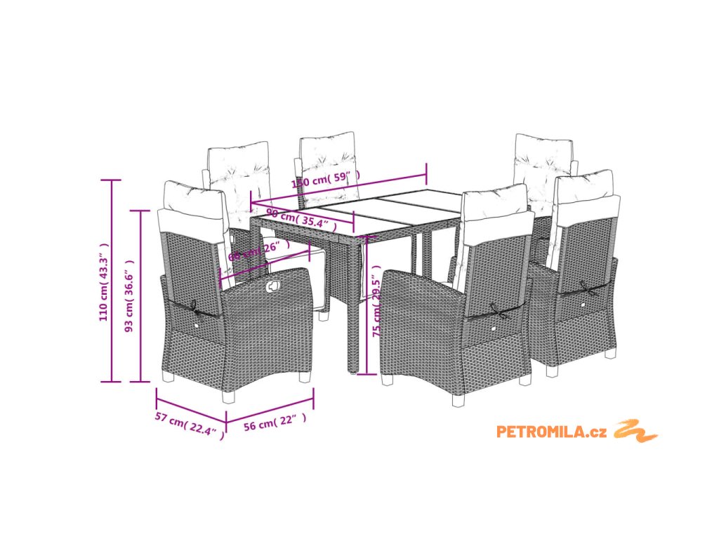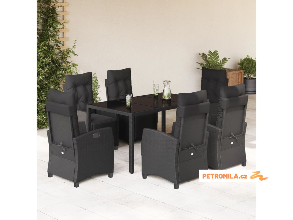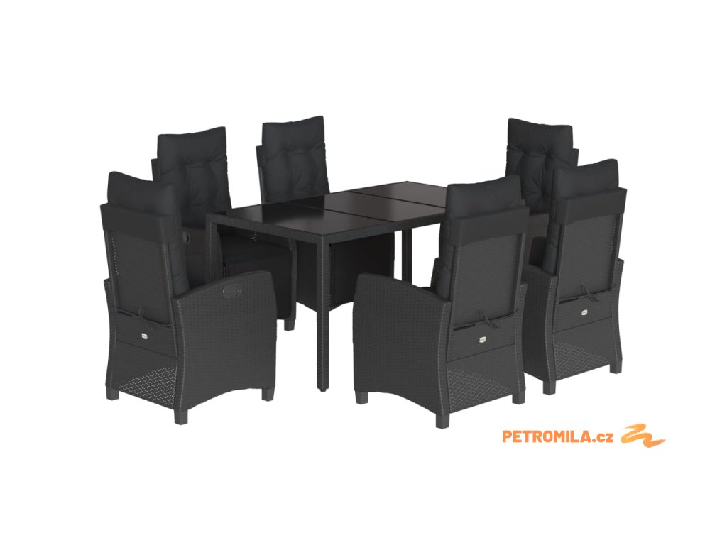 7dílný zahradní jídelní set s poduškami černý polyratan