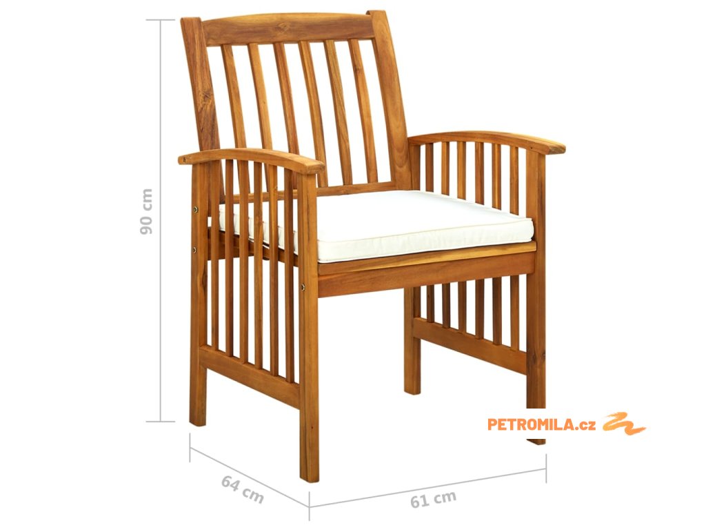 Jídelní stůl je vyrobený z masivního akáciového dřeva, tvrdého dřeva s hustou strukturou, takže je robustní, odolný a snadno se udržuje. Na dřevěnou stolní desku můžete prostřít k jídlu, servírovat nápoje a odkládat si celou řadu věcí. Dřevěné rámy židlí jsou ošetřené olejem a na vaši terasu nebo dvorek vnesou klasický vzhled a vaše venkovní bydlení oživí svým přírodním šarmem. Hustě polstrované podušky vám poskytnou dodatečné pohodlí při sezení a relaxaci. Tuto sestavu zahradního nábytku můžete snadno očistit vlhkým hadříkem.