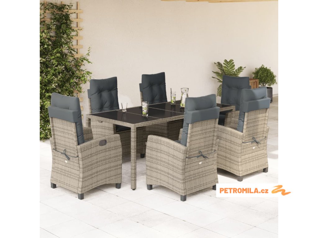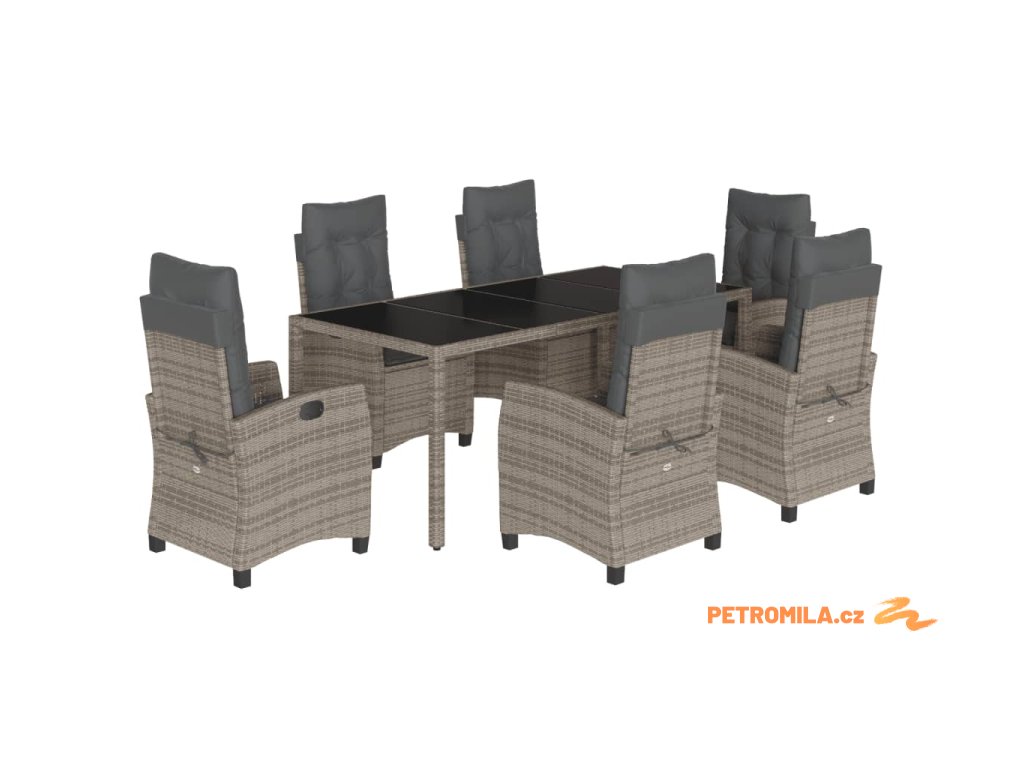 7dílný zahradní jídelní set s poduškami šedý polyratan