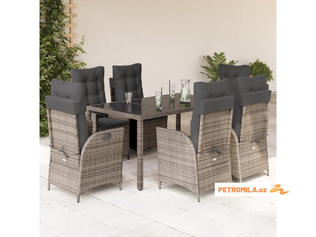7dílný zahradní jídelní set s poduškami šedý polyratan