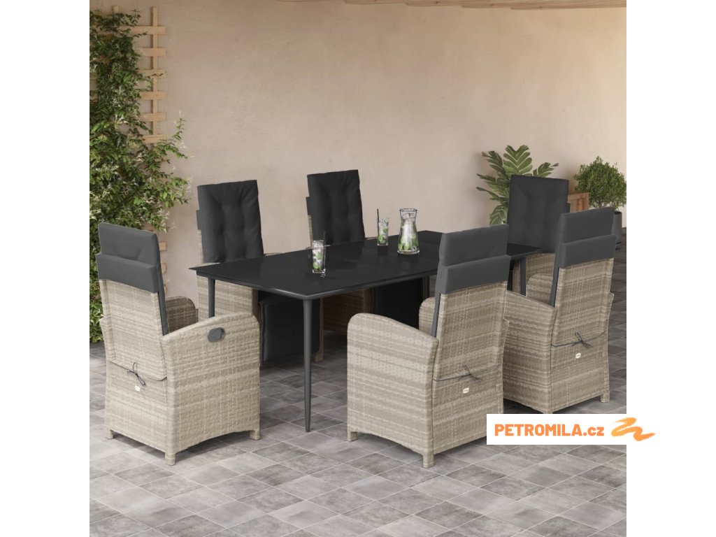 7dílný zahradní jídelní set s poduškami světle šedý polyratan