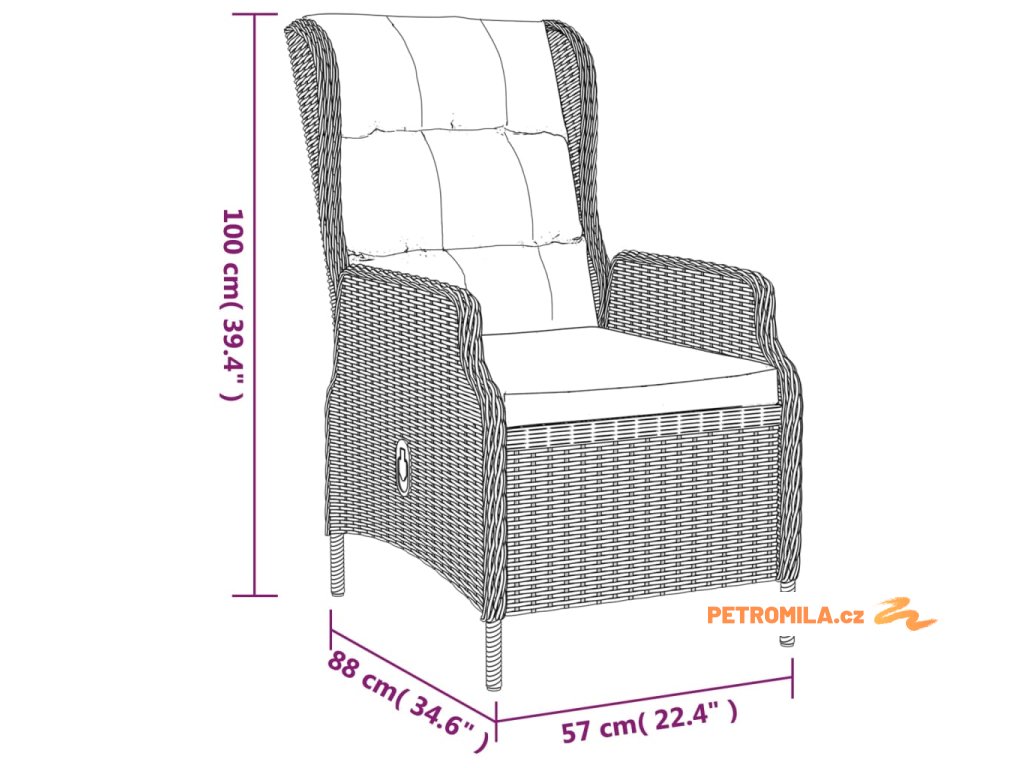 - Rozměry židle (vzpřímená poloha): 57 x 88 x 100 cm (Š x H x V)