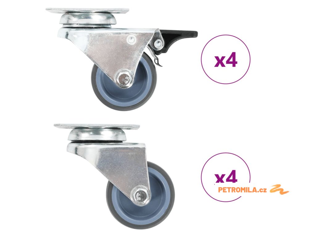 - Balení obsahuje 4 otočná kolečka a 4 otočná kolečka s brzdou
