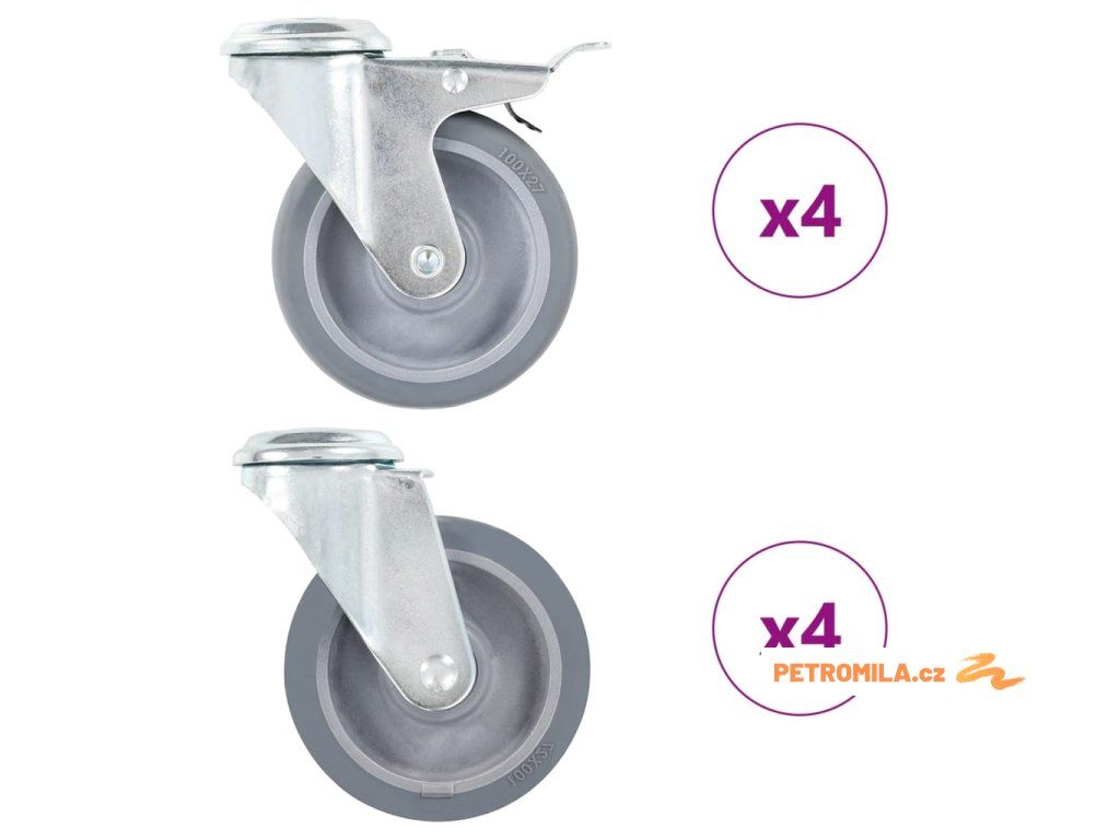 - Balení obsahuje 4 otočná kolečka s otvorem pro šroub a 4 otočná kolečka s otvorem pro šroub a brzdou