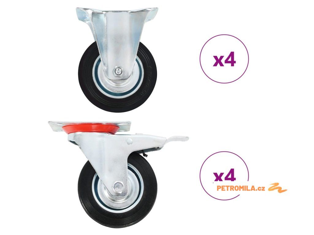 - Balení obsahuje 4 pevná kolečka a 4 otočná kolečka s brzdou