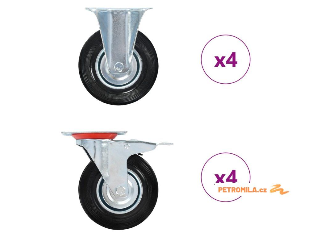 - Balení obsahuje 4 pevná kolečka a 4 otočná kolečka s brzdou