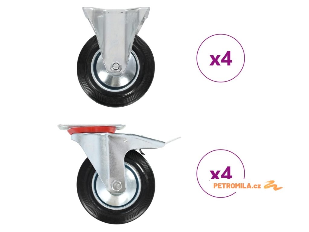 - Balení obsahuje 4 pevná kolečka a 4 otočná kolečka s brzdou