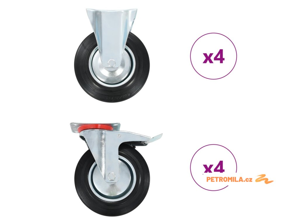 - Balení obsahuje 4 pevná kolečka a 4 otočná kolečka s brzdou