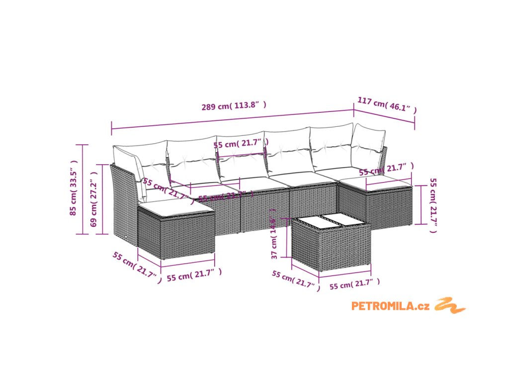 - Celkové rozměry pohovky: 289 x 117 x 69 cm (Š x H x V)