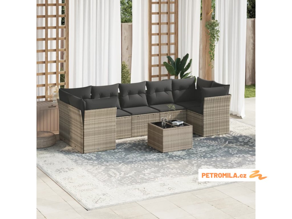 8dílná zahradní sedací souprava a podušky světle šedá polyratan
