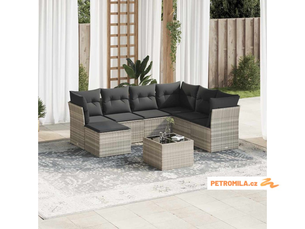 8dílná zahradní sedací souprava a podušky světle šedá polyratan