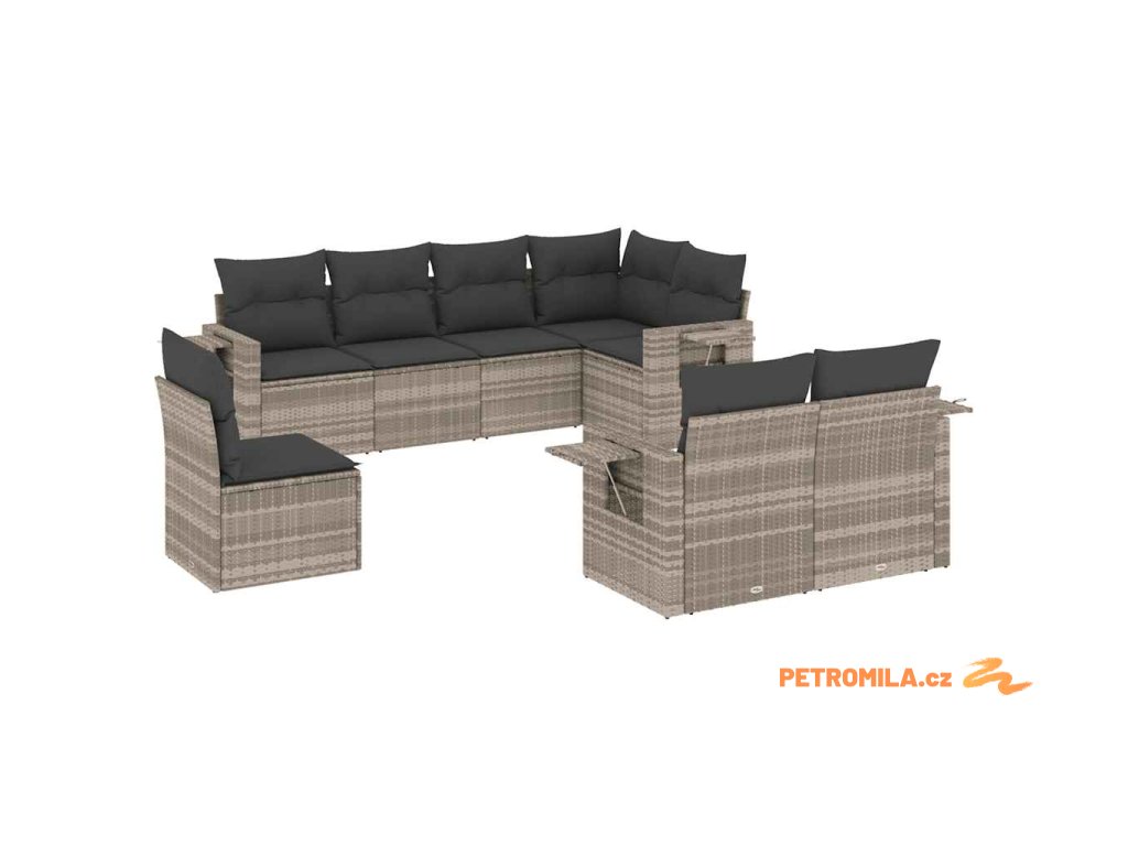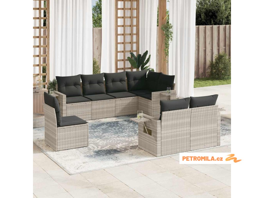 8dílná zahradní sedací souprava a podušky světle šedá polyratan