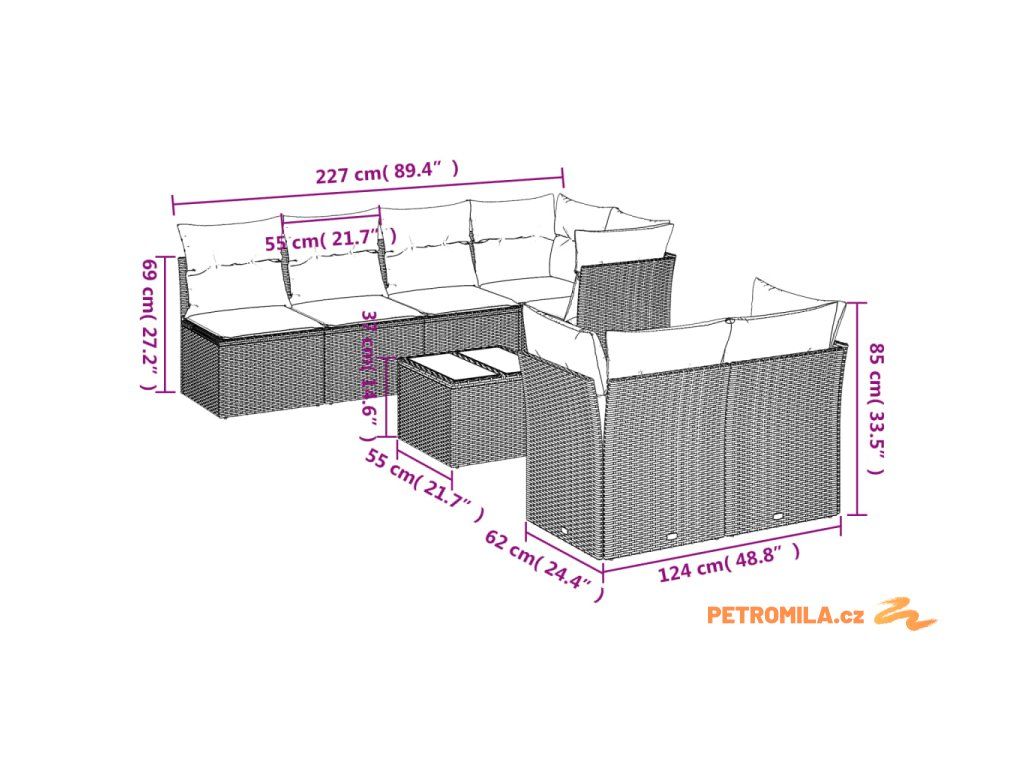 - Celkové rozměry 5místné pohovky: 227 x 124 x 69 cm (Š x H x V)
