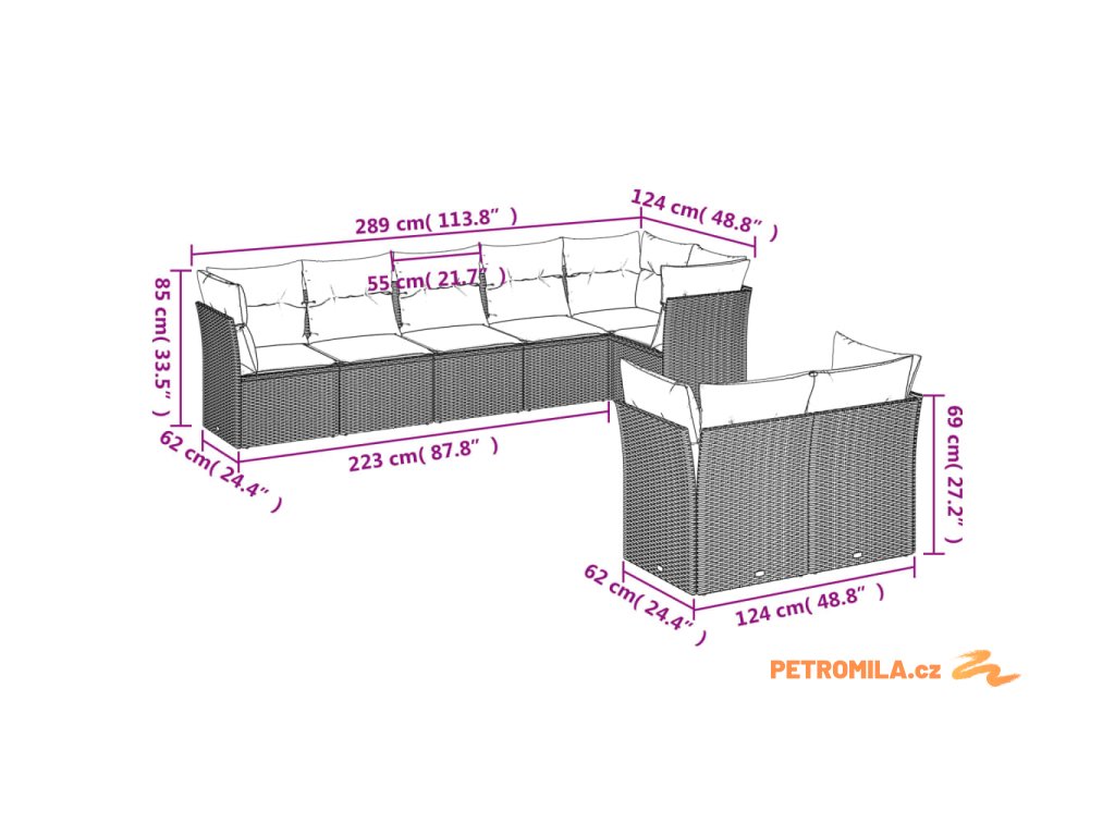 - Celkové rozměry 6místné pohovky: 289 x 124 x 69 cm (Š x H x V)