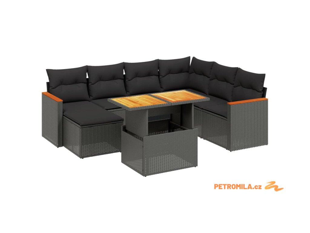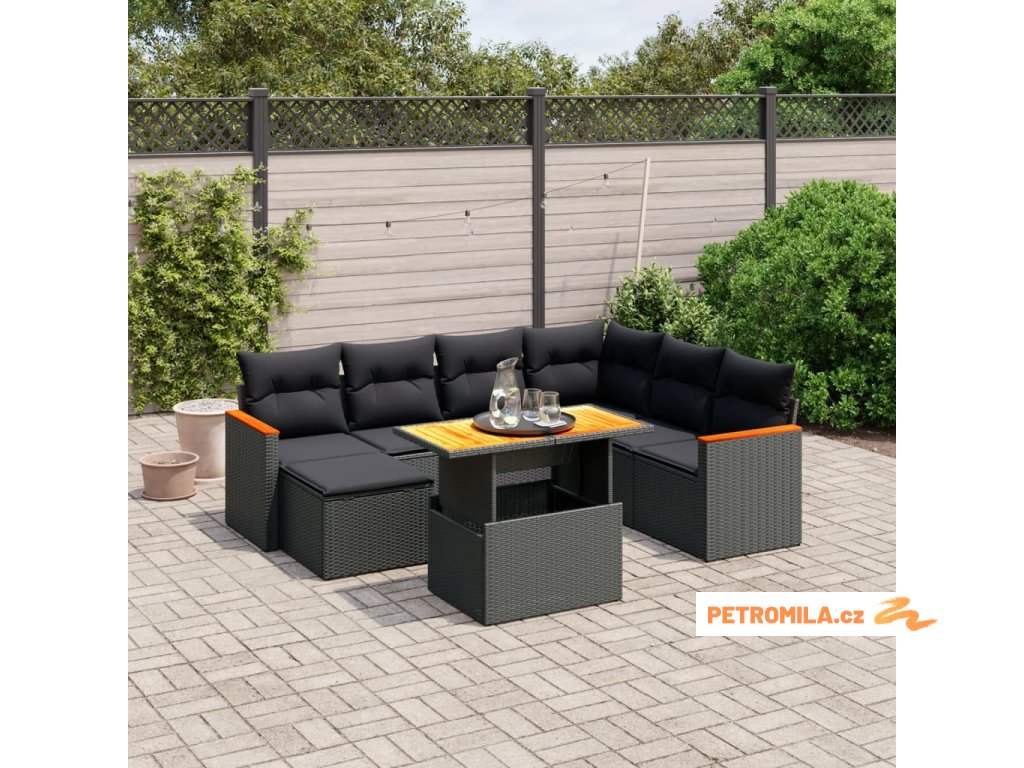 7dílný zahradní jídelní set s poduškami černý polyratan