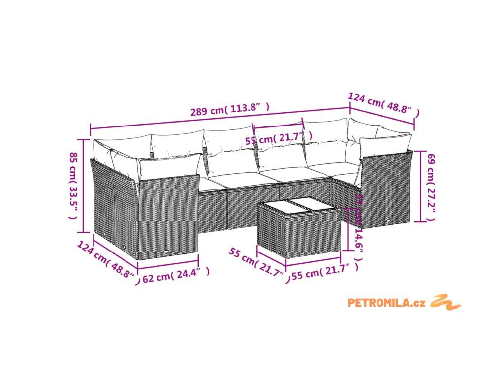 - Celkové rozměry pohovky: 289 x 124 x 69 cm (Š x H x V)