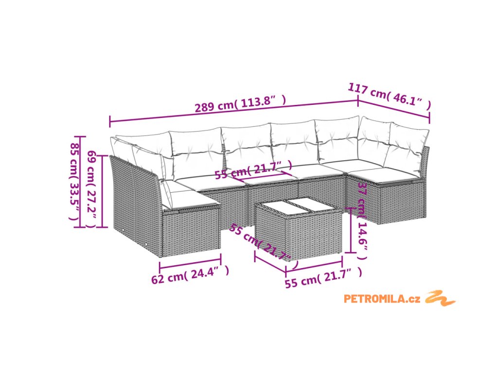 - Celkové rozměry pohovky: 289 x 117 x 69 cm (Š x H x V)
