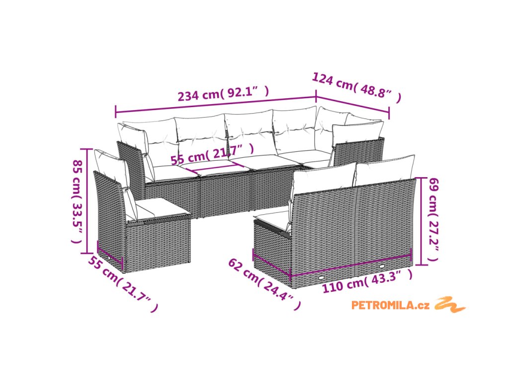 - Celkové rozměry 5místné pohovky: 234 x 124 x 69 cm (Š x H x V)