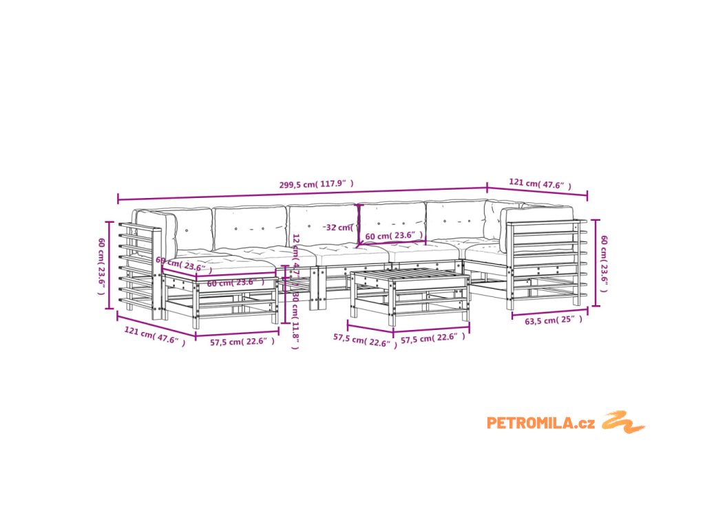 - Rozměry středové pohovky: 57,5 x 63,5 x 60 cm (D x Š x V)