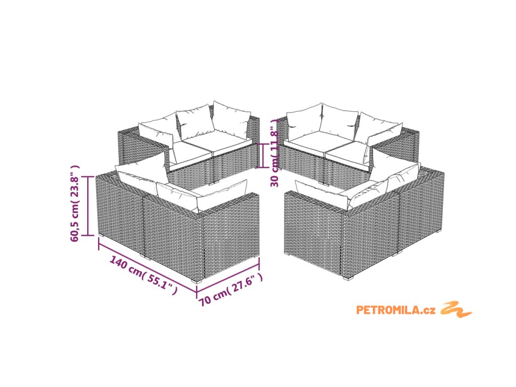 - Rozměry rohové pohovky (každé): 70 x 70 x 60,5 cm (D x Š x V)