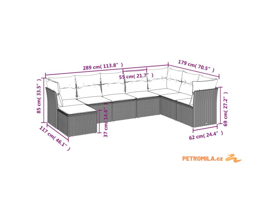 - Celkové rozměry pohovky: 289 x 179 x 69 cm (Š x H x V)