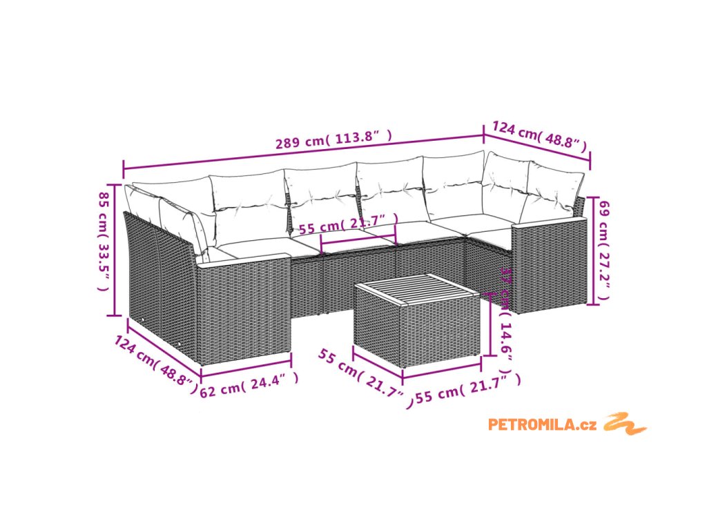 Sada zahradních pohovek s polštářem 8 pcs Šedá Poly ratan