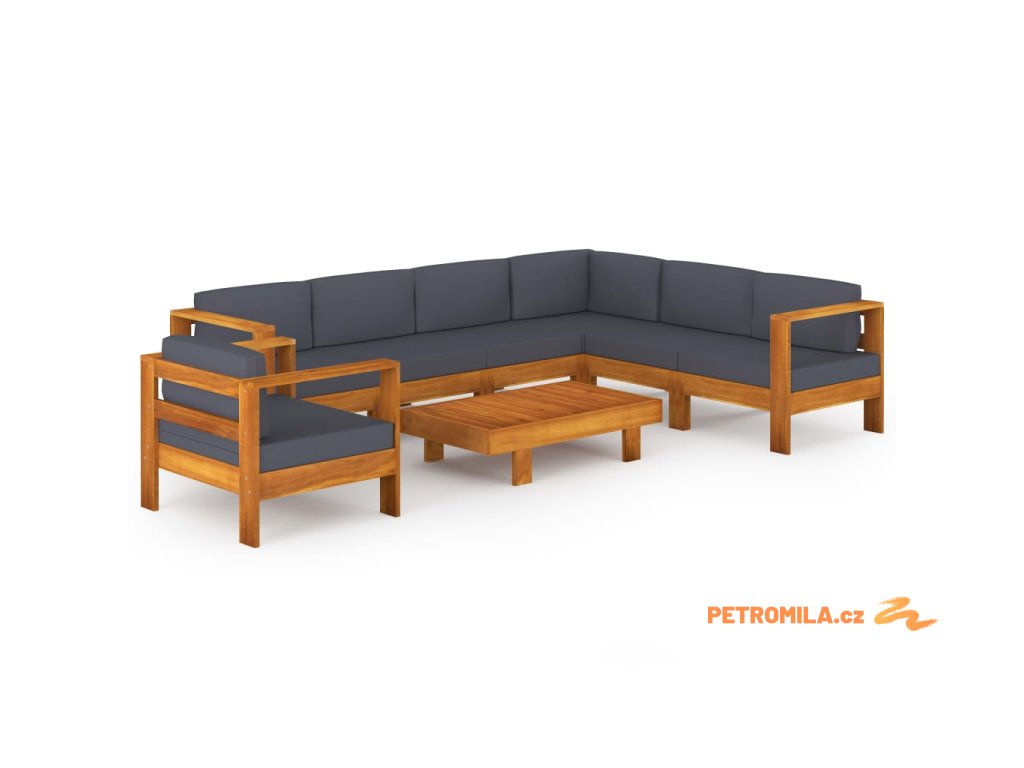 8dílná zahradní sedací souprava s tmavě šedými poduškami akácie