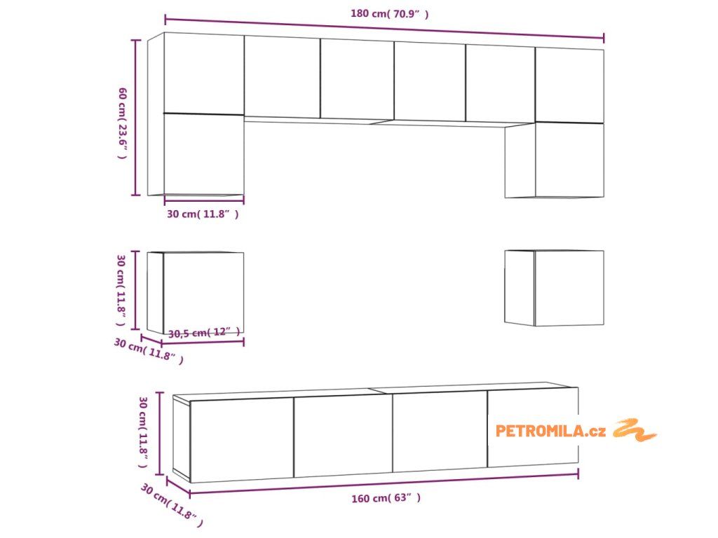 - 4x TV skříňka: 60 x 30 x 30 cm (Š x H x V)