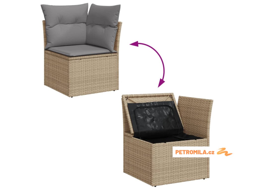 - Úložný prostor s voděodolným vakem: Každý zahradní sedací díl má úložný prostor pod sedákem, který je opatřen voděodolnou vložkou a poslouží vám k ukládání podušek, hraček a dalších věcí. Vnitřní vaky mají horní kryt a lze je bezpečně připevnit k sedákům pomocí suchého zipu, což zaručí větší stabilitu.