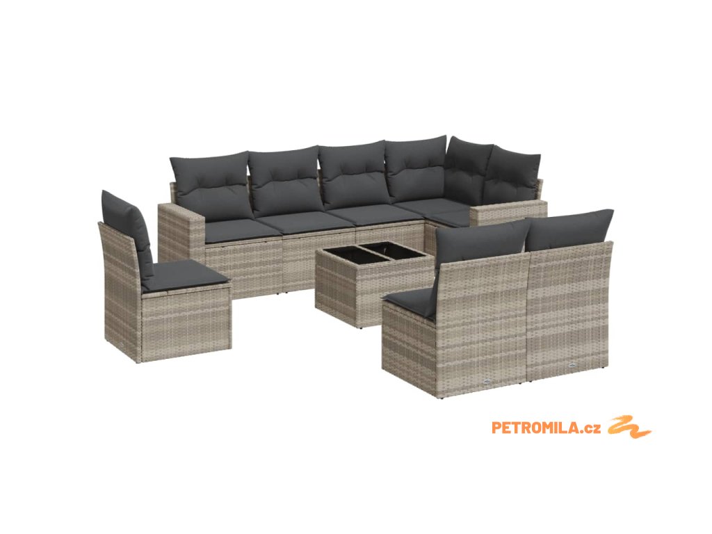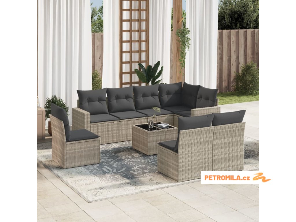 9dílná zahradní sedací souprava a podušky světle šedá polyratan