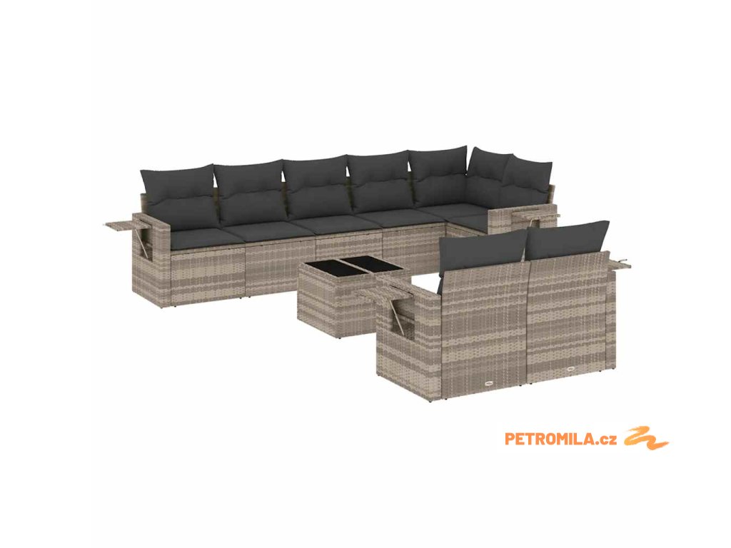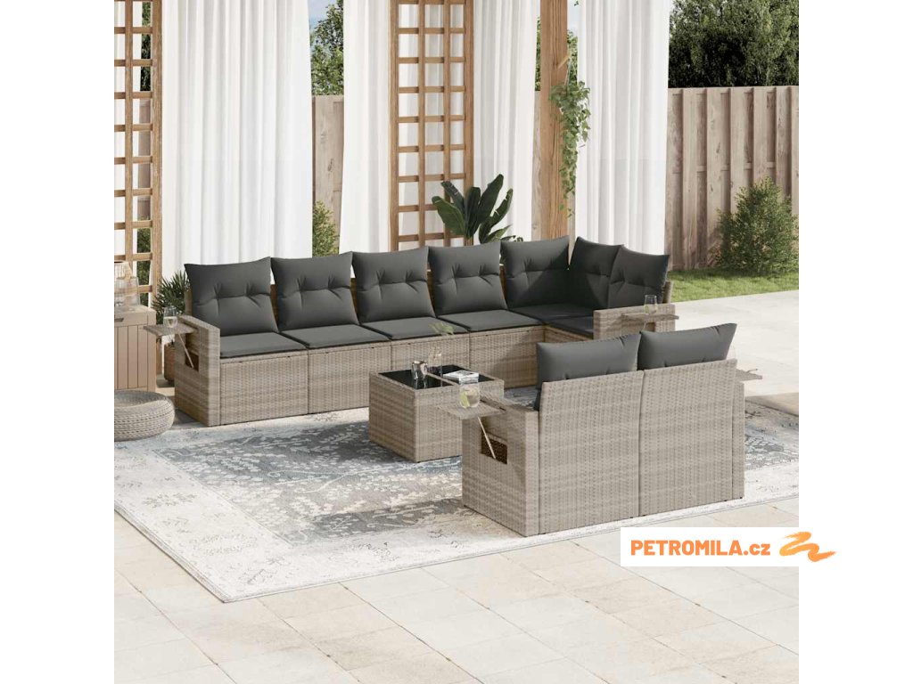 9dílná zahradní sedací souprava a podušky světle šedá polyratan